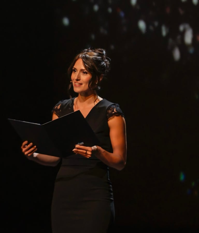 As a professional actress, I feel at home on stage. I don’t just address the audience I connect with them wholeheartedly and hold a space that creates rhythm, warmth, and professionalism for every event.